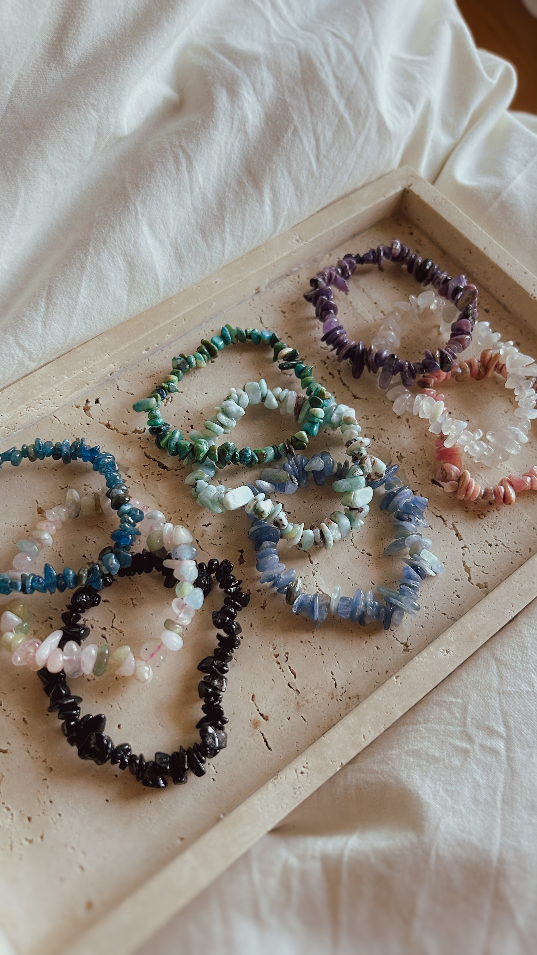 Bracciali in pietra dura naturale formato chips, con elastico. Una selezione di pietre dure e semipreziose ricavate da piccoli pezzi forati, irregolari, levigati ma non modellati secondo una forma artificiale. Le Chips esprimono tutta la naturalezza delle pietre, mantenendo la loro forma unica e la loro naturale energia!